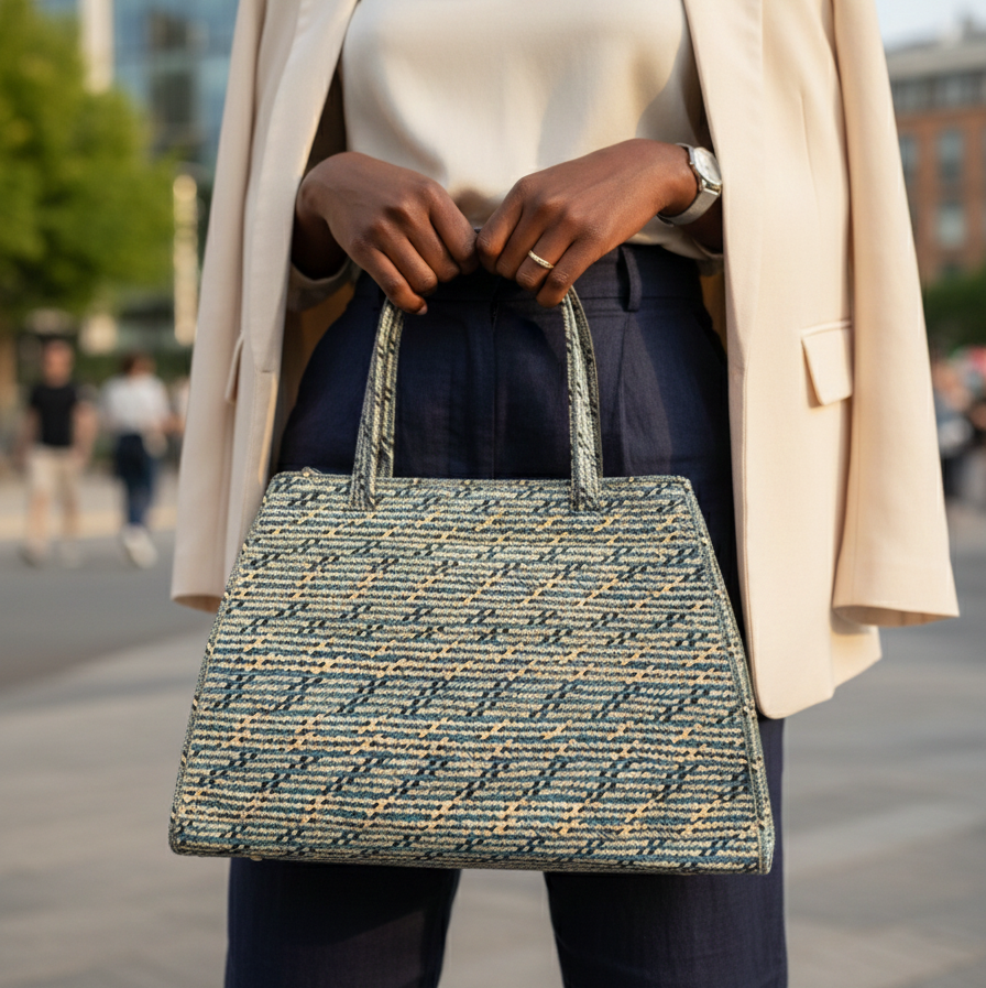 Esosi's caña flecha bag features distinct braided patterns handcrafted by the skilled Zenu artisans from Colombia. This handbag has a large interior, a zipper closure, and a fabric lining.