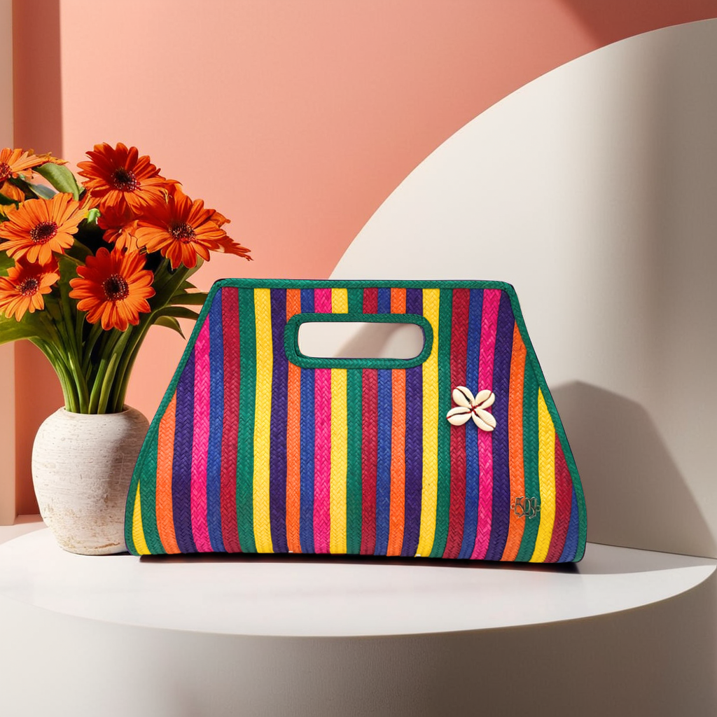 Esosi's multicolored caña flecha bag showcases vibrant braided patterns handcrafted by skilled Zenu artisans of Colombia. Designed to stand out, it features one main compartment, a magnetic snap closure, soft fabric lining, and a removable strap.