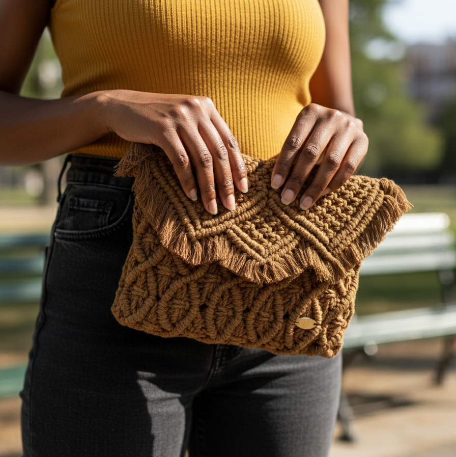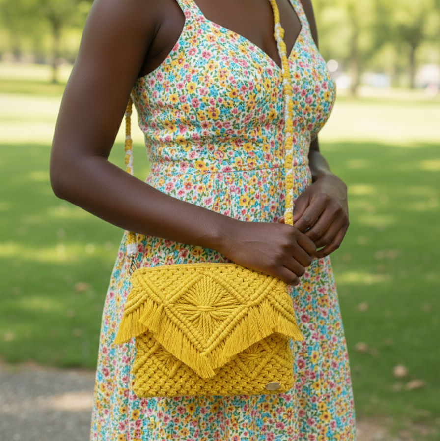Available in a variety of colors, this macramé bag is a must-have addition to your accessory collection.