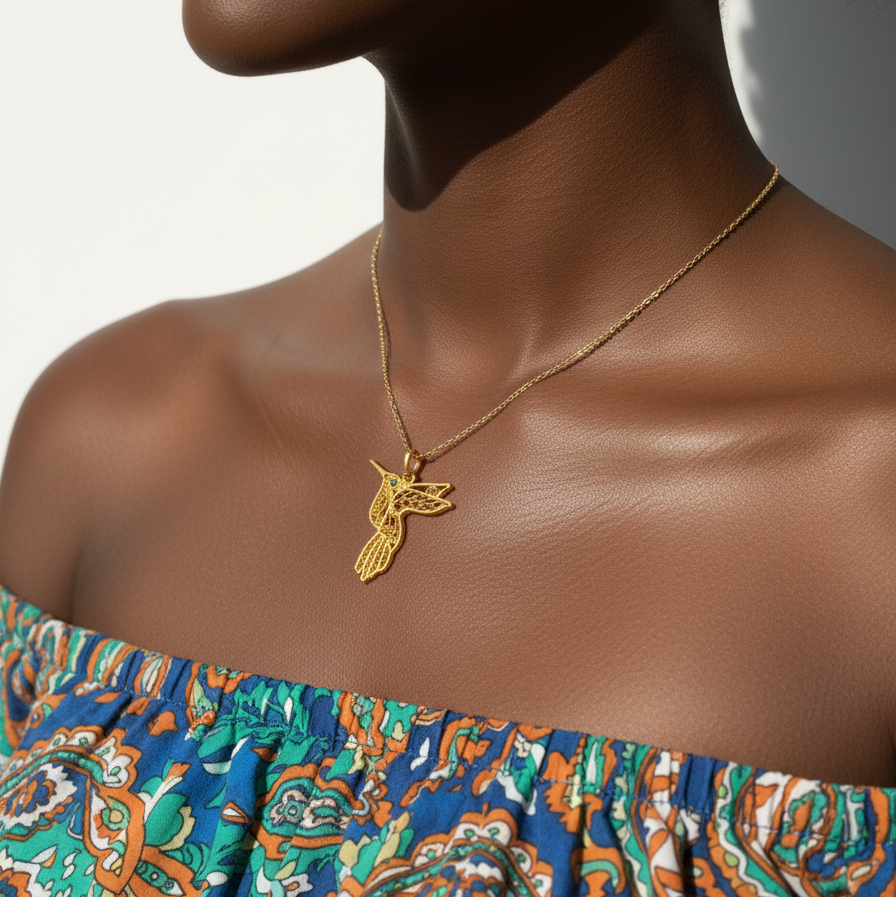 Handcrafted pendant featuring a raw emerald stone and bronze dipped in 24k gold. Using the traditional filigree technique, artisans weave intricate patterns that reflect generations of Colombian skill and creativity, creating a truly elegant and meaningful piece of wearable art.